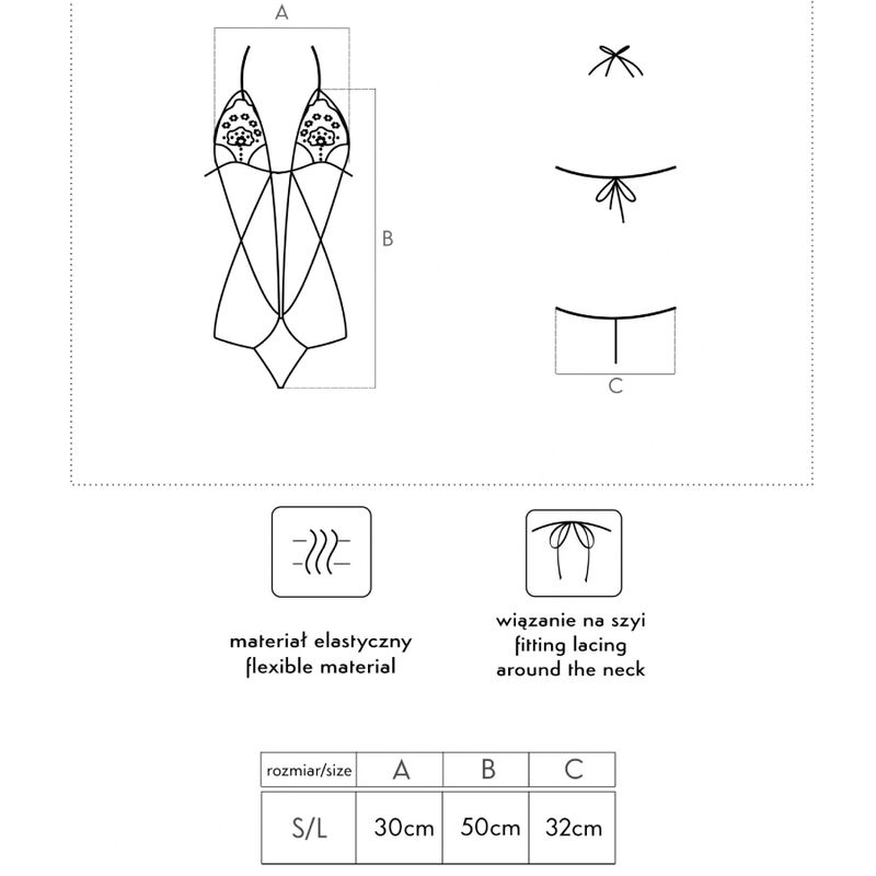 Elastyczny materiał (90% poliamid i 10% elastan) sprawia, że body jest przyjemne w dotyku i wygodne w noszeniu. Regulowany ściągacz przy szyi i plecach ułatwia dopasowanie body, dlatego jest dostępne w uniwersalnym rozmiarze S/L.