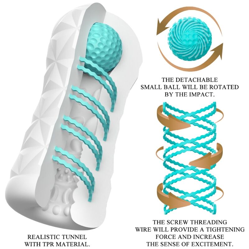 Małe narzędzie do gigantycznej masturbacji! Ten przezroczysty i wielokrotnego użytku masturbator posiada obracającą się spiralę i kulkę stymulującą z boku. Obracająca się spirala sprawia, że masturbator obraca się podczas penetracji, a kulka na górze stymuluje odpowiednie miejsce, zapewniając nowe doznania. Osłonka ma stymulującą i podniecającą fakturę wewnątrz, która intensywnie i dynamicznie masuje penisa podczas pracy manualnej. Możesz używać tego stylowego, przyjaznego dla skóry masturbatora wielokrotnie. Bardzo łatwy w użyciu i zapewnia czystą przyjemność!